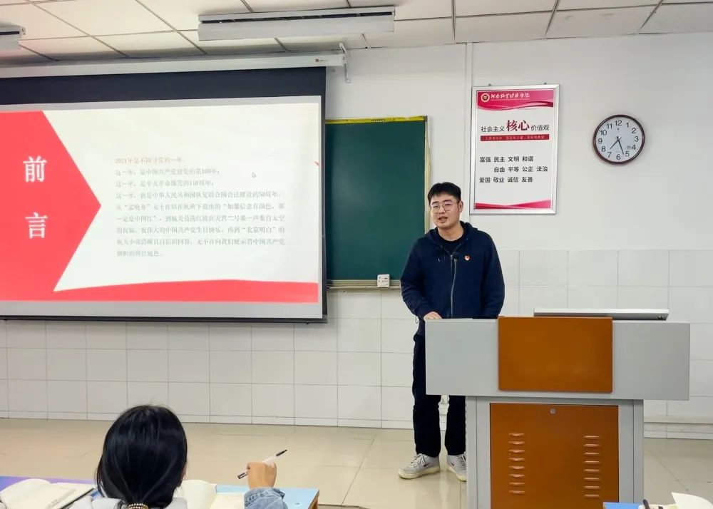 本次党课的主题《端正入党动机,争做合格党员》,本次党课主要内容是如何端正自己的入党动机,侯丁琳老师开篇引用今年热门电影《长津湖》来让同学们谈谈自己对影片的看法,同学们积极呼应老师,说出影片带来的深刻印象和当年红军艰苦战斗的经典场景所引发的感慨。随后提出当前老员工党员存在的主要问题。学员们深入思考,举手发言,讲出自己对老员工党员存在问题的理解。刘天宇老师对大家参与党课应该保持的状态做出了指正,对积极参与党课的同学非常赞赏。然后,刘老师从“入党动机是什么”这个问题切入课题,进行初步讲解。刘老师表示正确的入党动机是言行一致,既要在组织上入党,也要在思想上入党。同学们更加了解在大学阶段如何做好一名预备党员,如何开展和支持党的工作,如何树立踏实肯干的工作作风,如何服务同学,为员工党员的素质及党性修养的提高奠定了坚实的基础。