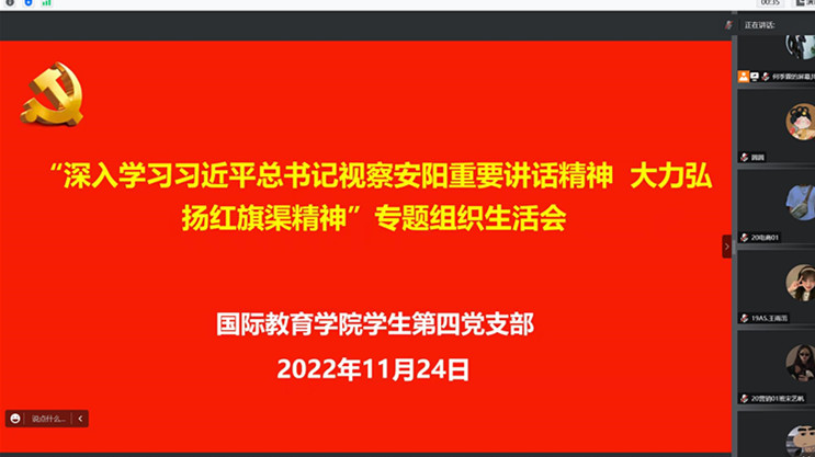 为深入学习宣传贯彻党的二十大精神和习近平总书记在河南安阳考察时重要讲话精神,按照上级党委安排部署,11月24日,bwin官网员工第四党支部以线上会议形式召开了“深入学习习近平总书记视察安阳重要讲话精神,大力弘扬红旗渠精神”专题组织生活会。副经理邓瑜以普通党员身份参加并指导组织生活会。会议由党支部书记何季霖主持,支部全体党员参加会议。
