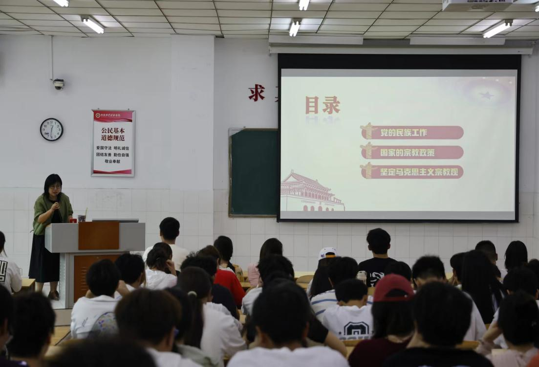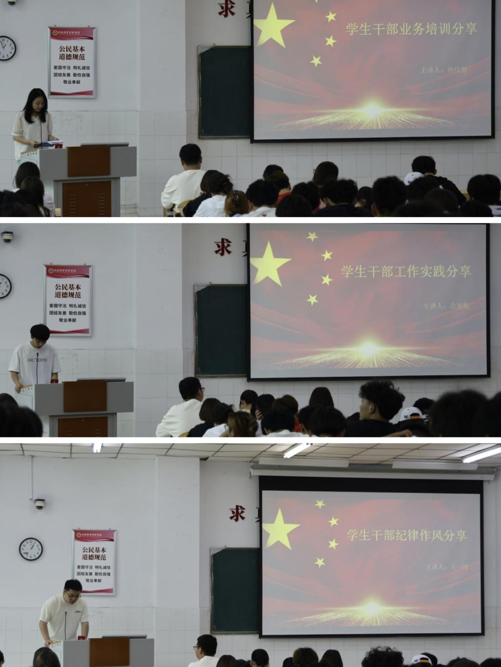 本次会议特别邀请了统战部民族宗教科科长霍婧媛老师,以及三位优秀员工干部代表进行讲解。霍婧媛老师从党的民族工作、国家的宗教政策、坚定马克思主义宗教观三个方面对员工干部进行了民族宗教理论知识培训。紧接着,三位优秀员工干部代表分别针对业务培训、工作实践、纪律作风三个不同的方面进行经验分享。主席团成员孙佳彤,从业务流程方面告诫我们要注重总结,讲究工作的方式方法;主席团成员余智航,以志愿活动为例,从加强团队协作等方面向我们提出要求;纪检部部长王一博指出:员工干部应该严于律己、以身作则,如此才能在团学会的工作中砥砺前行。会议现场掌声不断,老师与代表们的指导与倡议,深深吸引了在场的每一位员工干部,引起了他们的深刻反思,受益匪浅。