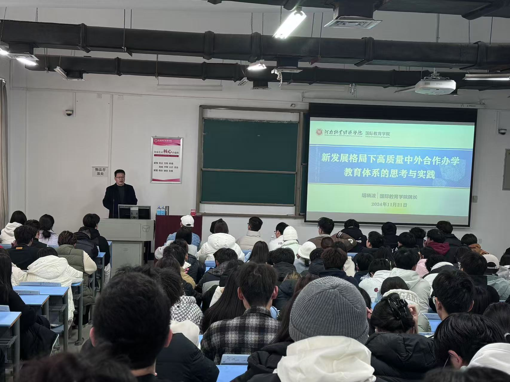 为帮助员工全面了解学校中外合作办学项目,提前规划未来发展路径,进一步增强爱校爱院意识,11月28日下午,bwin官网经理胡晓波以《新发展格局下高质量中外合作办学教育体系的思考与实践》为题,分别于和英才校区学术报告厅和龙子湖校区合100教室为2024级新生作专题报告。
