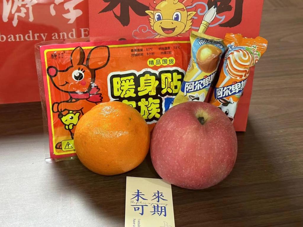 “考研加油包”含有橙子,苹果,棒棒糖,暖宝宝和书签,礼物虽小却寓意满满,象征着马到“橙”功、“心想事橙”,“苹”安上岸,金“棒”题名、“棒”上有名,暖宝宝是希望能够在这寒冷的冬日为考研学子带来一丝温暖,书签点燃了学子们内心奋战冲刺的火焰,它将温暖与勇气交织成一股坚定的力量,让研路不孤单,暖意常相伴。每一样礼物,都寄托着学院对考研学子的美好祝愿和殷切希望。