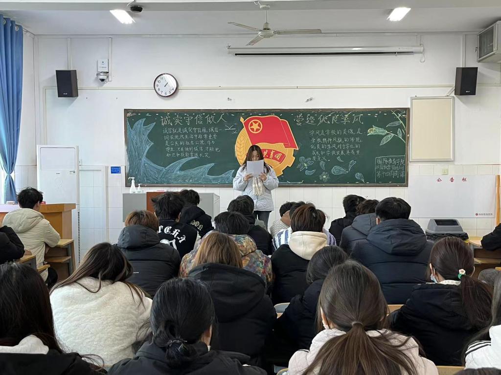 为进一步积极引导广大团员青年树立“诚信”意识,积极营造“励志勤学 善知笃行”的学风氛围。12月21日中午,在B楼开展“诚实守信做人,营造优良学风”主题团课。